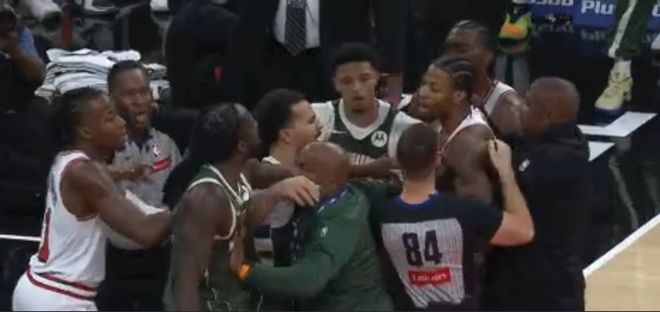 易邊再戰,字母哥與特納等主力在第三節繼續登場(chǎng)比賽,雄鹿連續三節比賽單節轟下30+得分,公牛也是連續兩節單節30+展開(kāi)對攻。字母哥逐步達成兩雙數據,引領(lǐng)雄鹿逐步擴大兩位數領(lǐng)先優(yōu)勢,第三節最后時(shí)刻,特里突破與普林斯糾纏沖突,一眾隊友也沖上來(lái),裁判也是被撞倒,裁判吹罰科林斯、波蒂斯、特里與普林斯各一次技術(shù)犯規,其中特里因為鎖喉被驅逐。雄鹿單節37-32再贏(yíng)5分,三節結束雄鹿102-93領(lǐng)先公牛。前三節比賽,雄鹿三分18-7凈勝11記三分外線(xiàn)多33分,字母哥13+10與特納19+6,引領(lǐng)雄鹿5人得分上雙,多森姆22分引領(lǐng)公牛3人得分上雙。